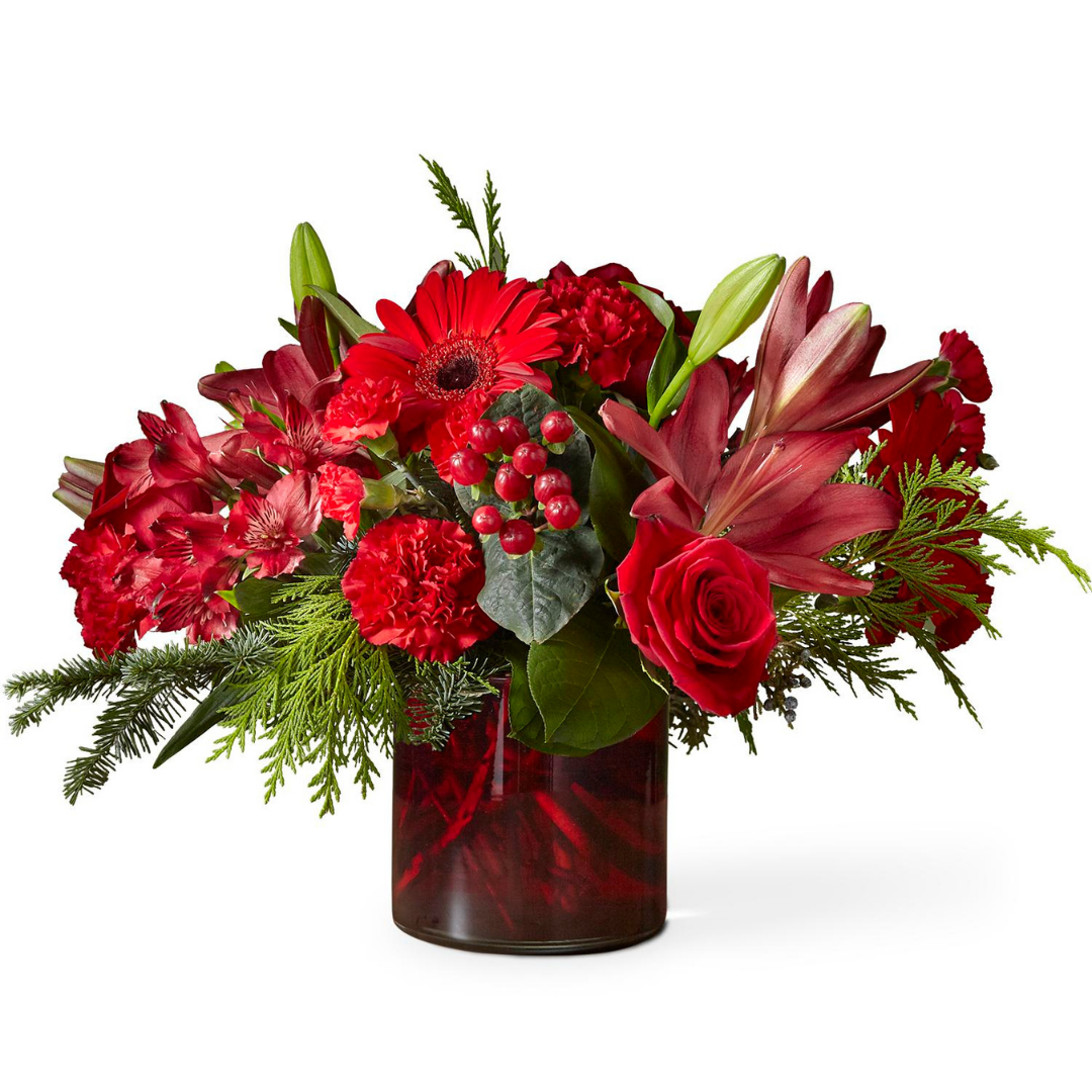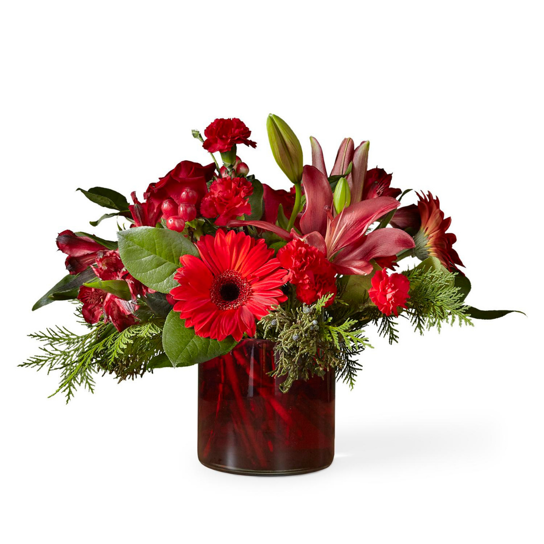 Add a touch of sophistication with the jewel tones of the Berry Merry Bouquet. This dynamic arrangement brings new life to classic stems while gerbera daisies and carnations showcase a rich red palette fit for the holiday.