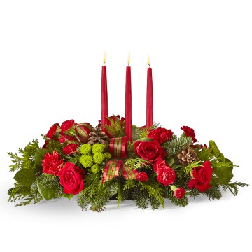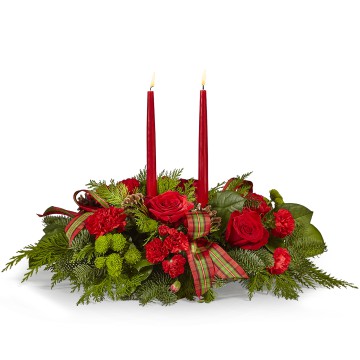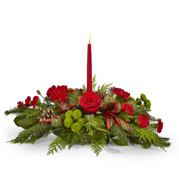 The By the Candlelight Centerpiece creates the perfect ambiance for your holiday meal. With classic taper candles soaring above a beautiful assortment of flowers and greenery, this centerpiece gives that cozy Christmas feeling to gatherings of friends and family.