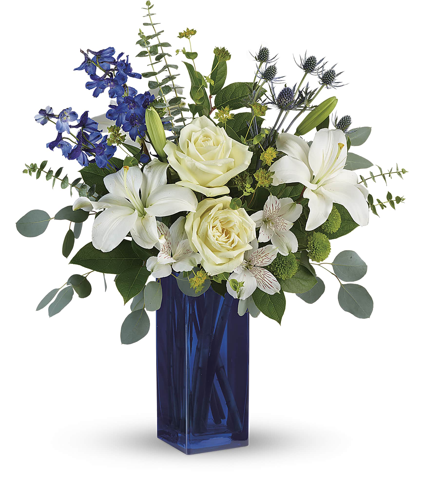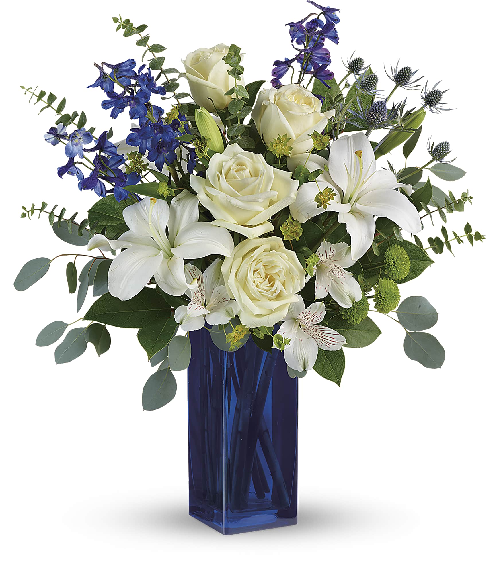 A classic for any occasion, this timeless bouquet of white roses and fragrant lilies in a rich, cobalt glass vase is sure to impress and delight.