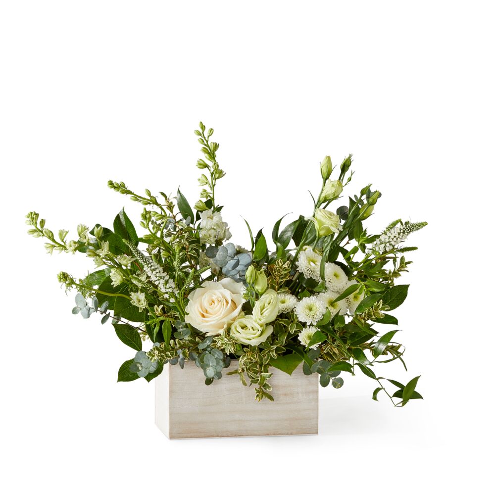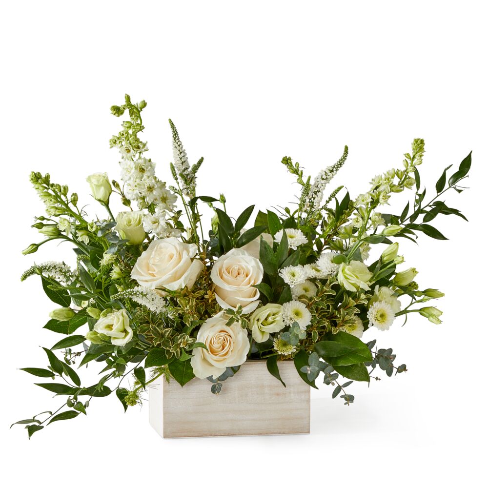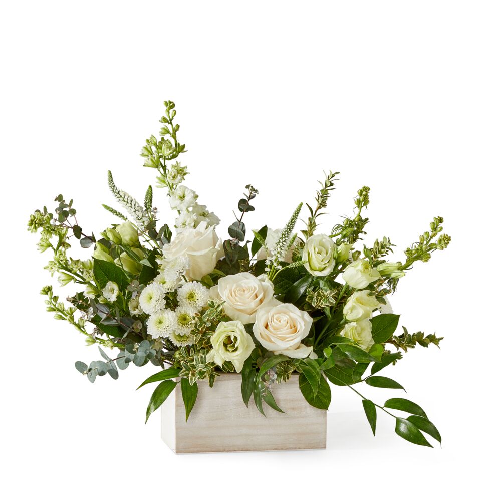 A beautiful arrangement of soft white florals creates a serene atmosphere, perfect for a wedding, anniversary, or as a thoughtful gesture of sympathy.