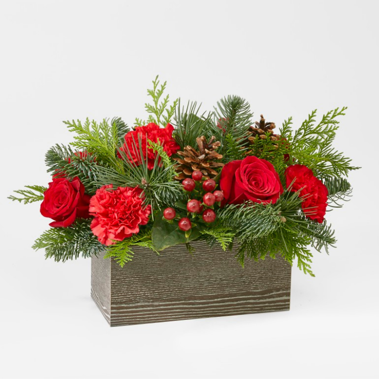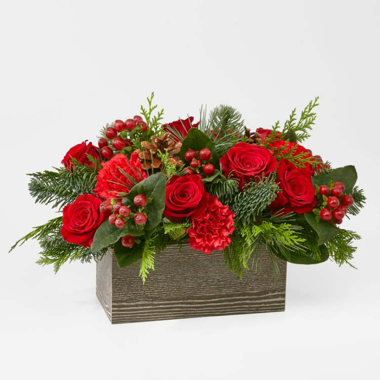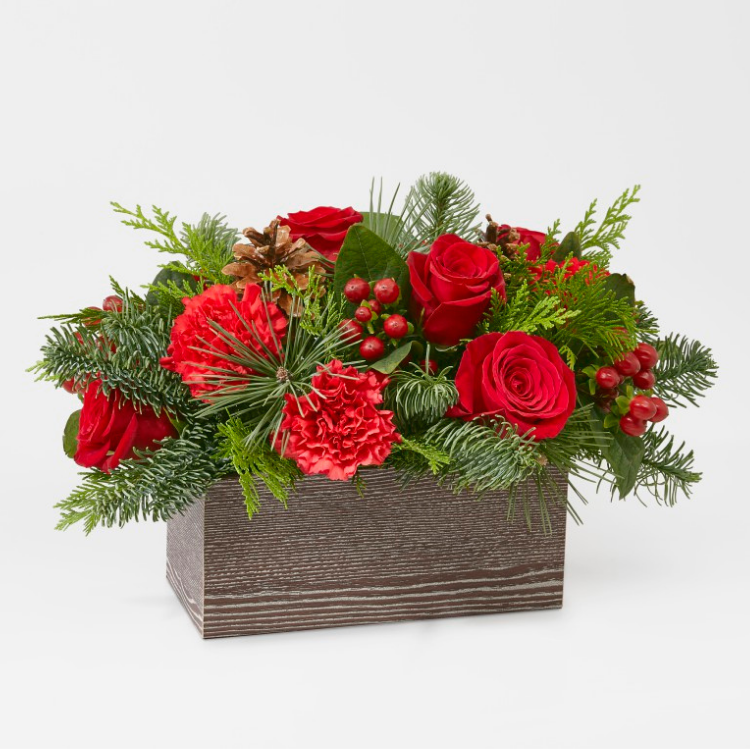 Inspired by the rustic outdoors of the holiday season, our Christmas Cabin Bouquet brings natural beauty indoors with a fresh take on the traditional red and green color pallet. Filled with roses, carnations, trick dianthus and assorted Christmas greens in a weathered wooden box, your loved ones will be delighted with this gift. Perfect as a centerpiece or décor in their home, this bouquet helps brighten up any occasion this Christmas.