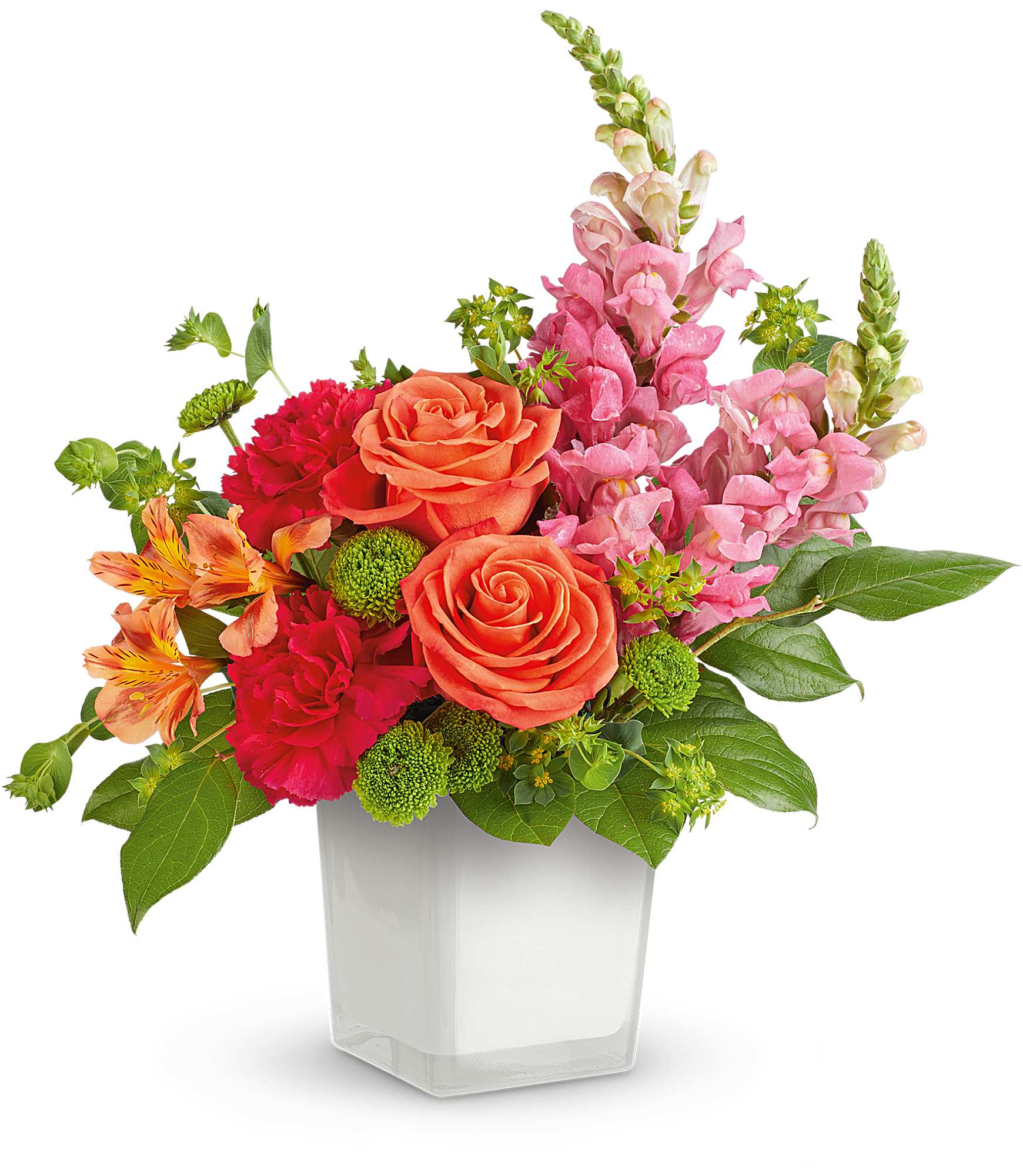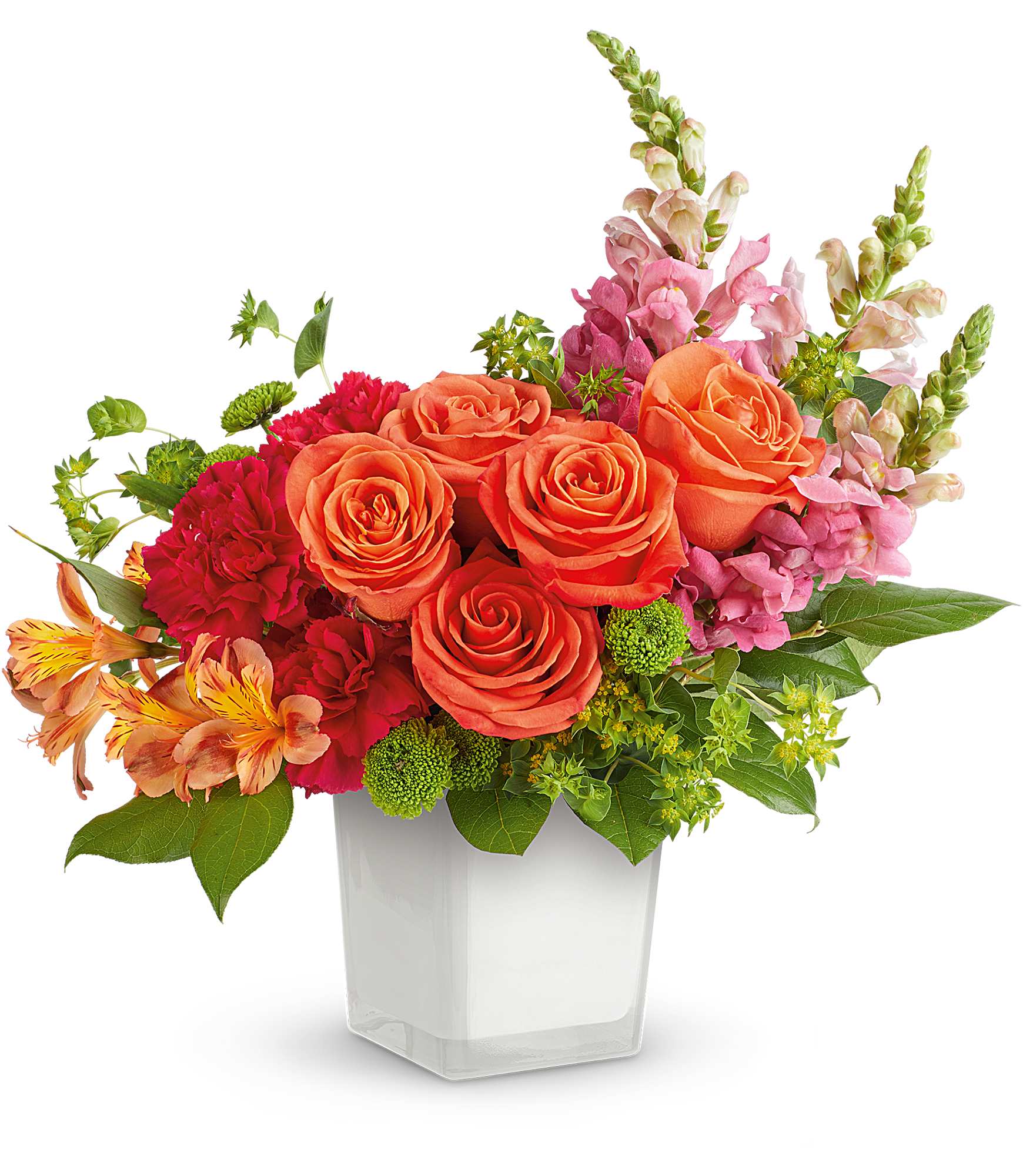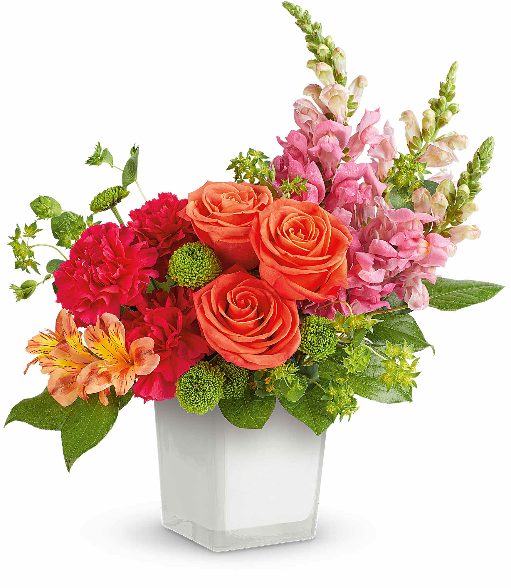 Fresh and full of energy, Teleflora's Citrus Sunset Bouquet glows with vibrant blooms, artfully arranged in Teleflora's Cloud Color Splash Cube. Bursting with bold color and modern style, it's the perfect pick-me-up for any occasion!