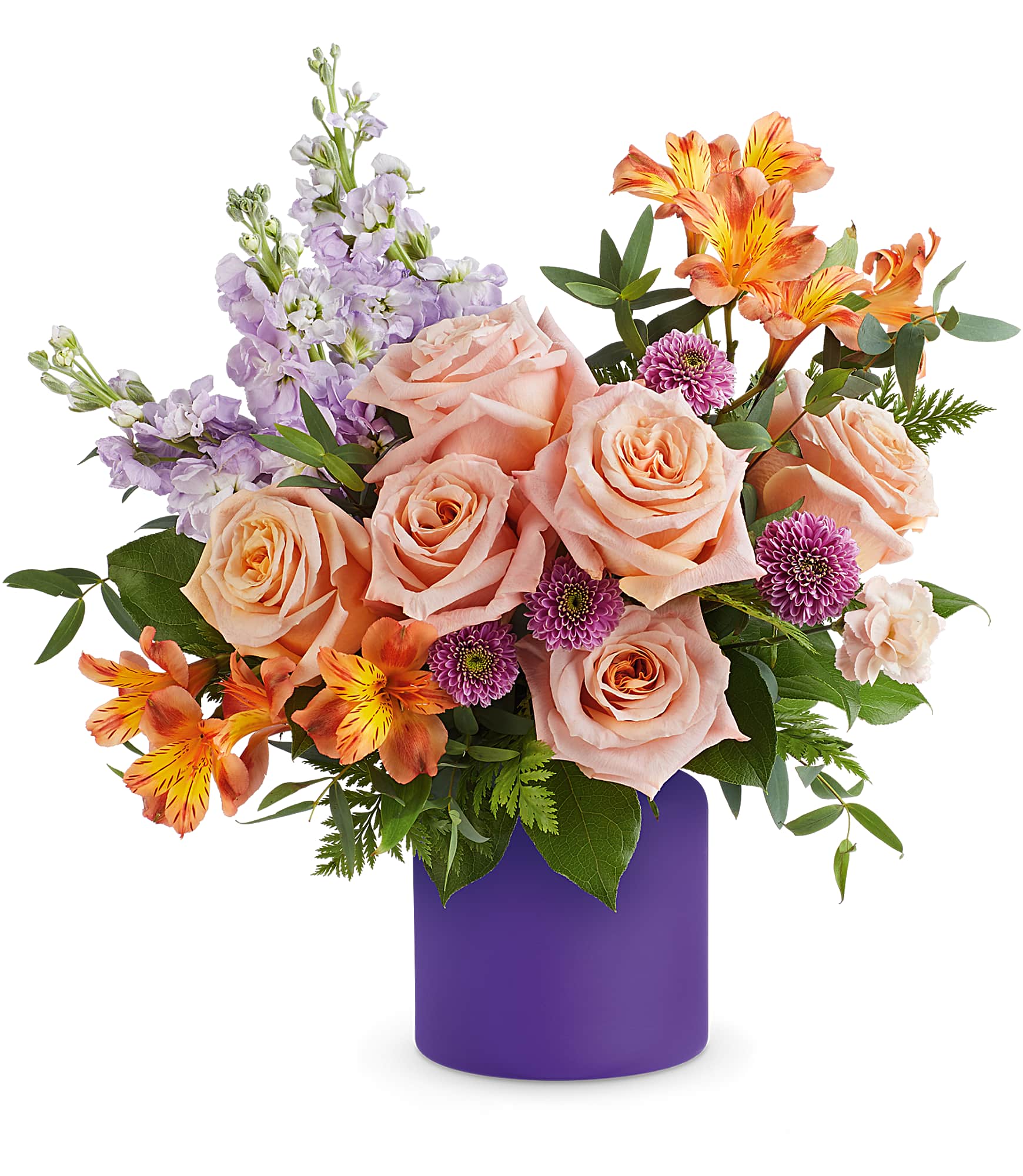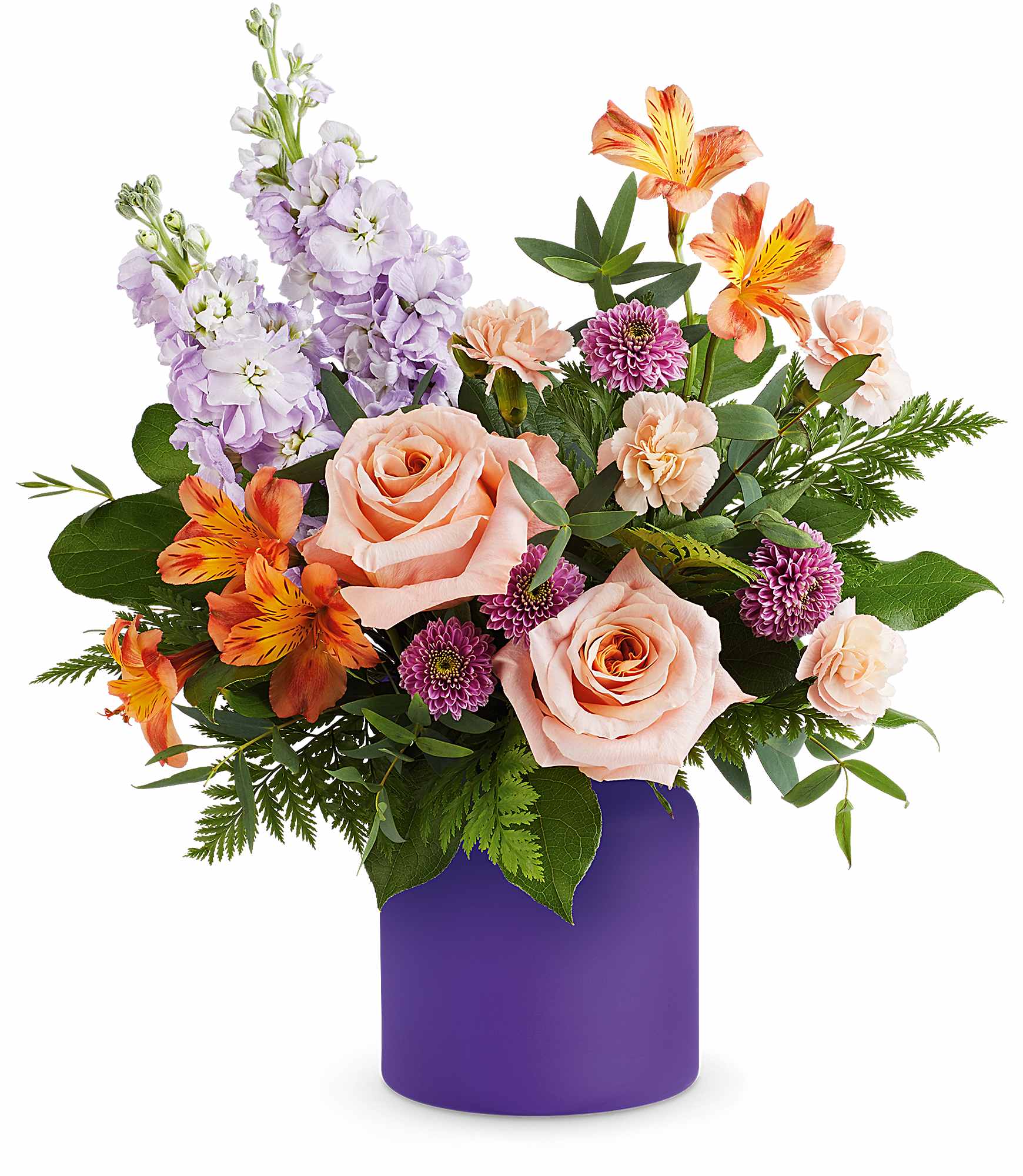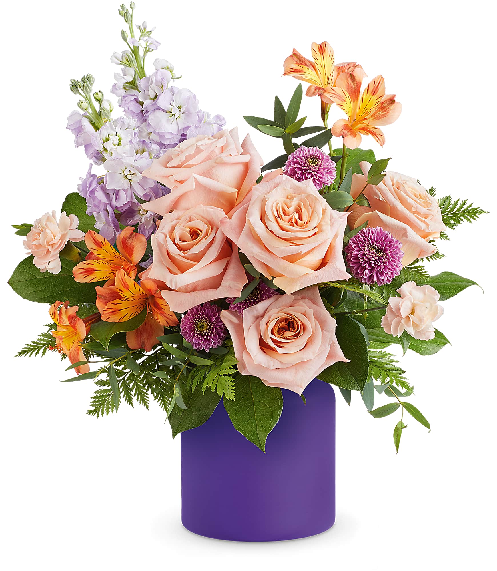Whimsical and bright, Teleflora's Dreamland Blooms Bouquet bursts with fresh pastel blooms, artfully arranged in bold Purple Savannah Jar. A stunning and stylish gift, it's the perfect way to add a pop of color and joy to any celebration!