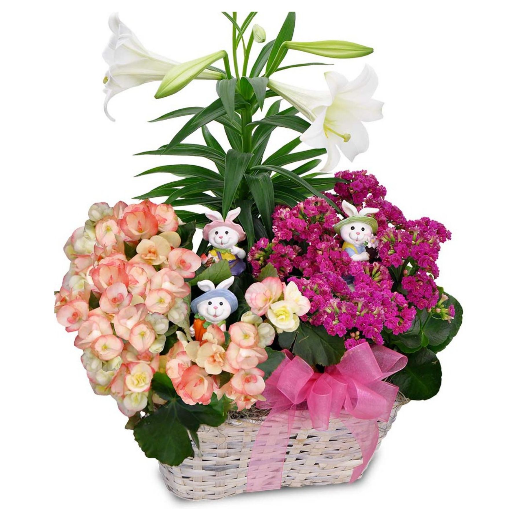 A blooming planter basket is a great Easter gift idea that is bright, colourful and includes blooming flowering plants, an easter lily and easter decor.