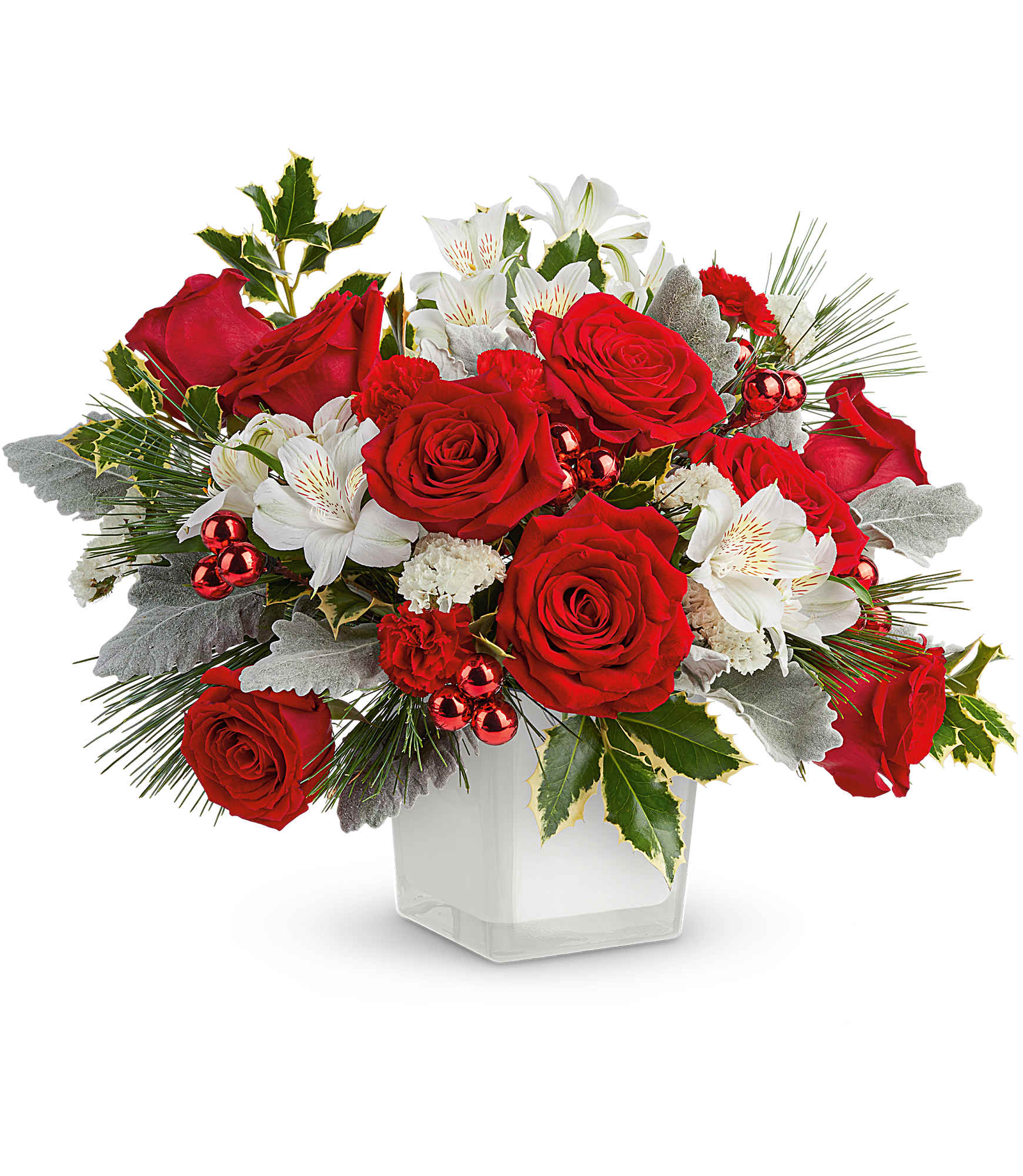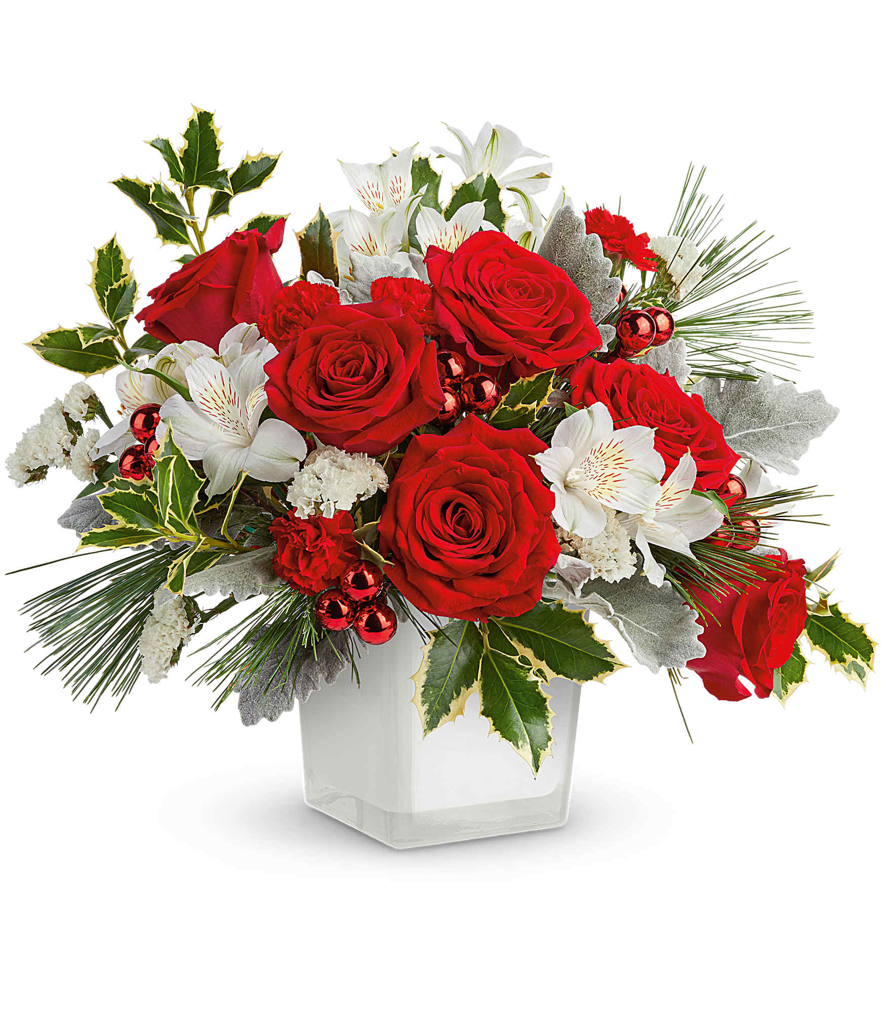 Our Festive Elegance Bouquet shines with classic red roses, wintery white blooms, and lush holiday greens in a modern white cube. A sophisticated gift or Christmas centerpiece full of seasonal cheer.