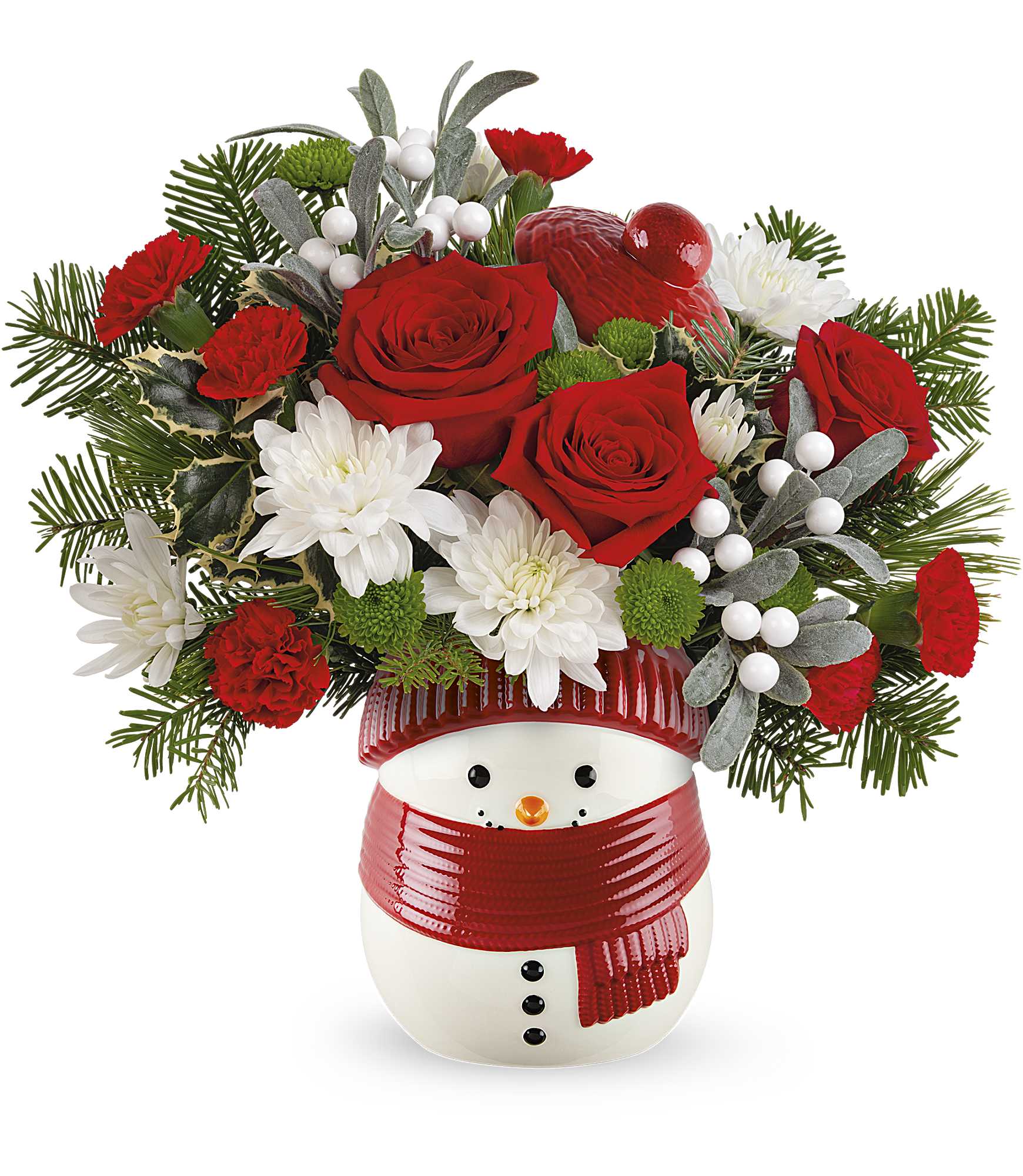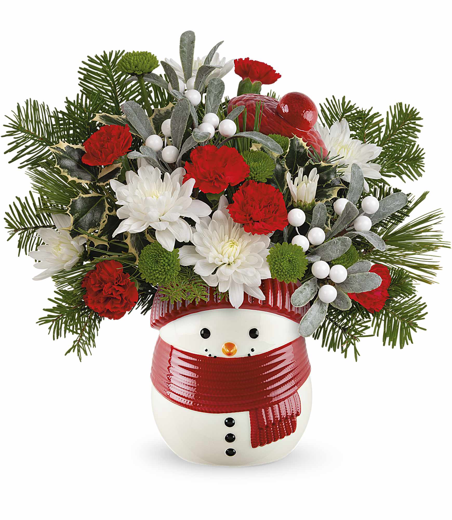 Bring the magic of winter into your home with our Frosty Wishes Bouquet. This charming arrangement features vibrant red carnations, cheerful white daisies, and festive Christmas greenery, beautifully accented with white berries. Presented in an adorable snowman vase, this bouquet captures the essence of the season with its playful design. Perfect for brightening up your holiday decor or as a delightful gift, the Frosty Wishes Bouquet is sure to spread joy and warmth to all who receive it.