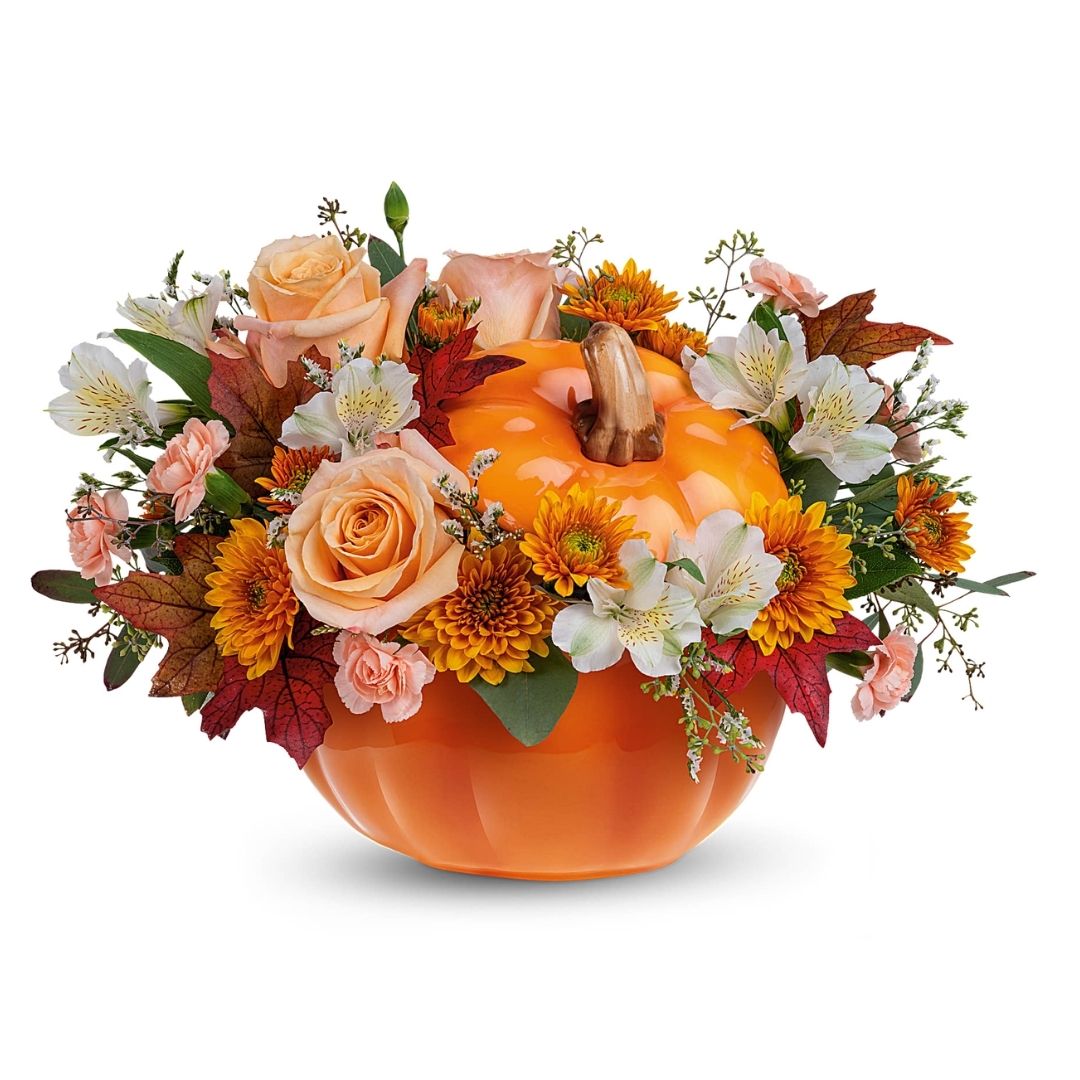 Welcome Fall into your home with this warm and cozy, Hello Pumpkin arrangement. The autumnal mix will add a sophisticated touch with crème roses combined with the warm hues of bronze chrysanthemums and peach mini carnations!