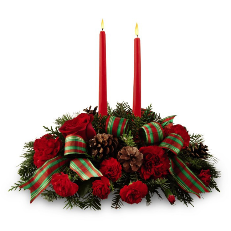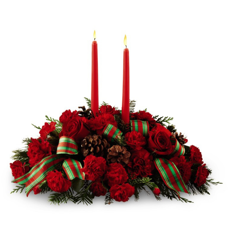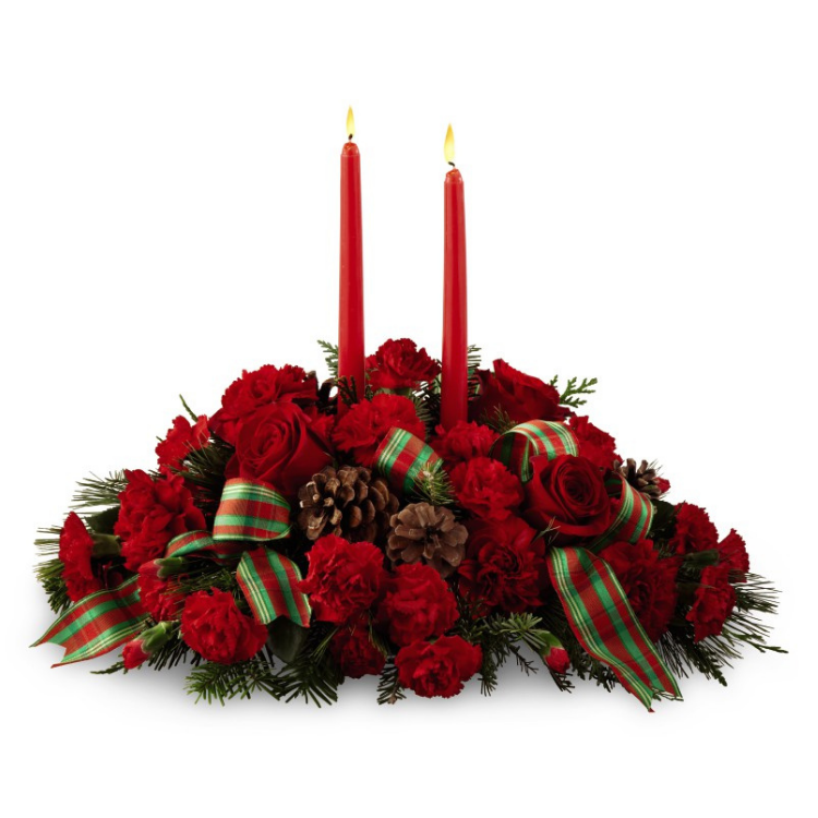 A classic red and green Christmas centerpiece with candles makes a perfect gift during the holidays. Featuring red carnations and red miniature carnations hand arranged with ample seasonal greenery, pine cones, two red taper candles and a charming red and green patterned ribbon.