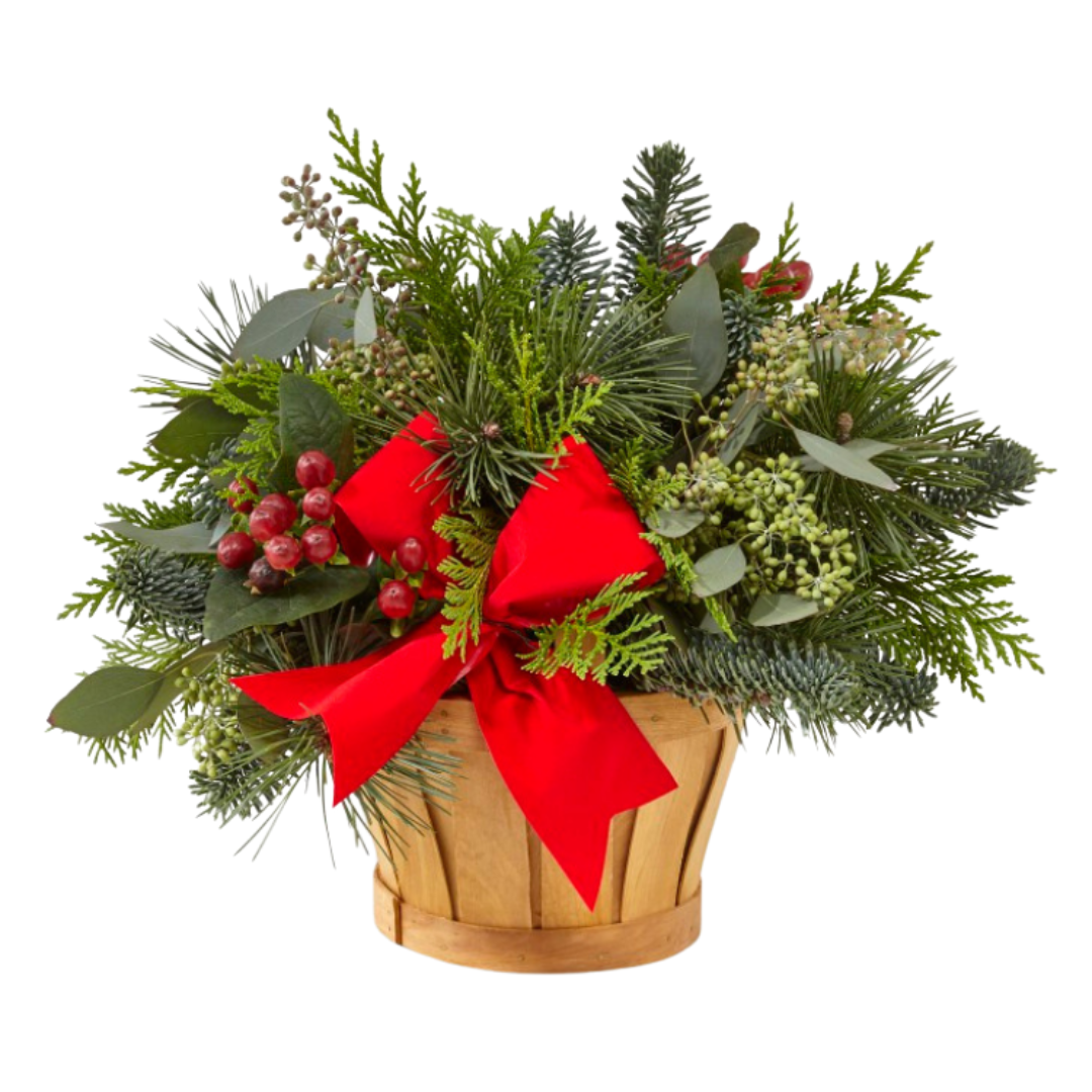 Whether you’re welcoming your family home or sharing a gift filled with natural cheer, our Holiday Homecomings Basket is the perfect arrangement to do so. A lush collection of assorted Christmas greens, seeded eucalyptus and holly come together a rustic wooden basket. Accented by a red ribbon and hypericum berries, this arrangement adds a touch of charm to wherever its placed.