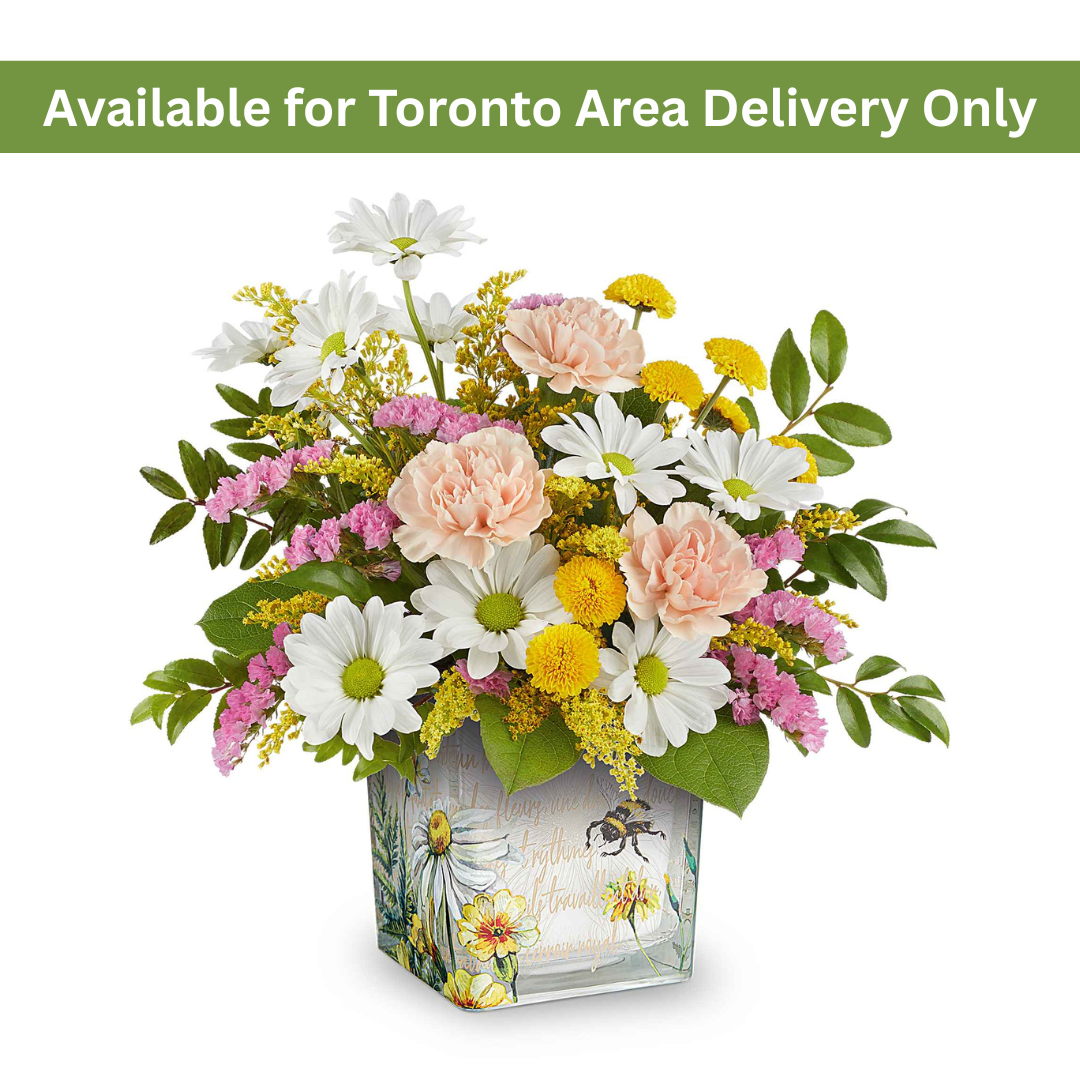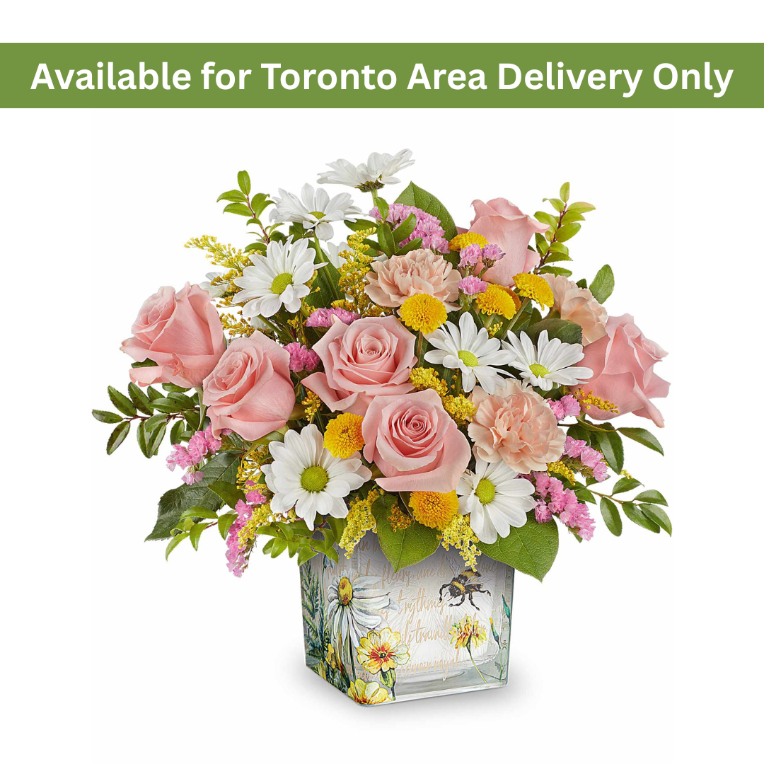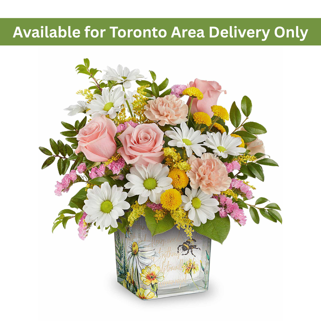 Their heart will buzz like a busy bee when this enchanting floral gift arrives, featuring serene blooms in a keepsake glass cube adorned with delightful vintage garden imagery.