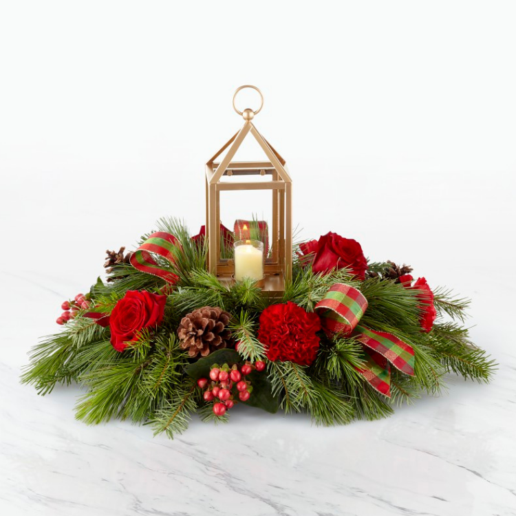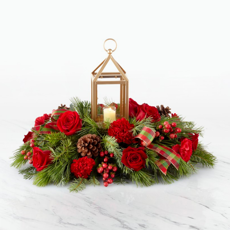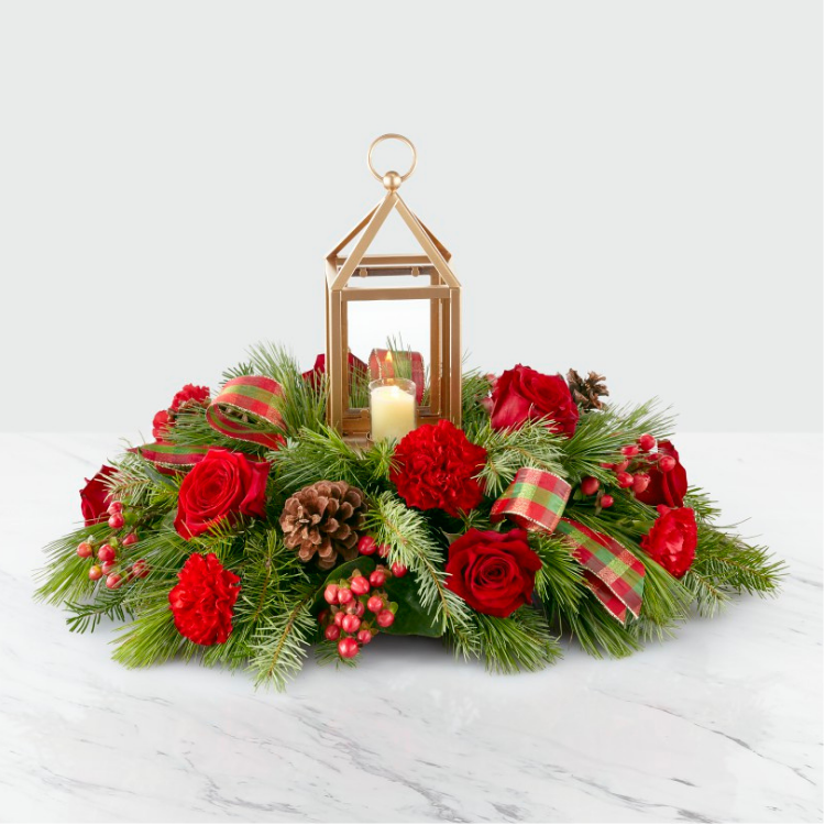 Bring your guests together with an elegant centerpiece worth gathering around. A stunning collection of roses, hypericum berries, carnations and Christmas greens sit around a matte golden lantern. Because there’s nothing red and green during the holidays. Whether you’re having the guests over or simply sharing your love this holiday season, our I’ll Be Home for Christmas Centerpiece helps light up every Christmas occasion.