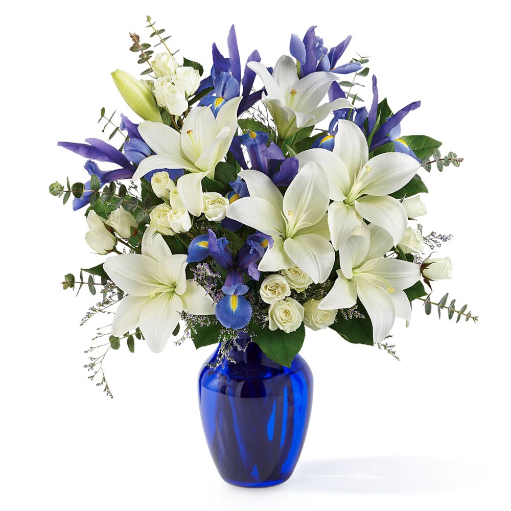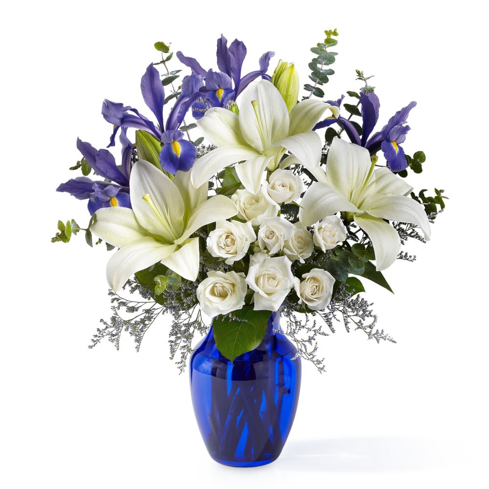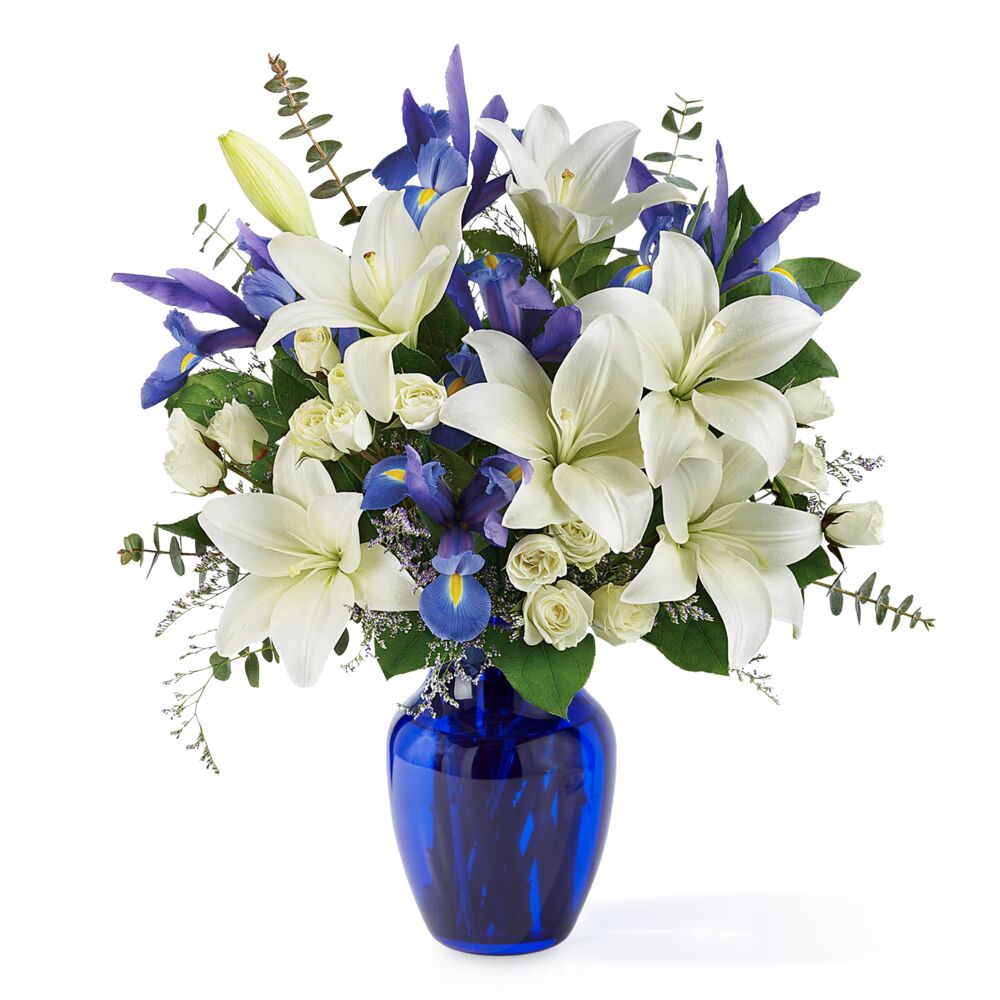 Take a deep breath with a peaceful blue and white bouquet, beautiful to offer condolences, get well wishes, or just make their day.