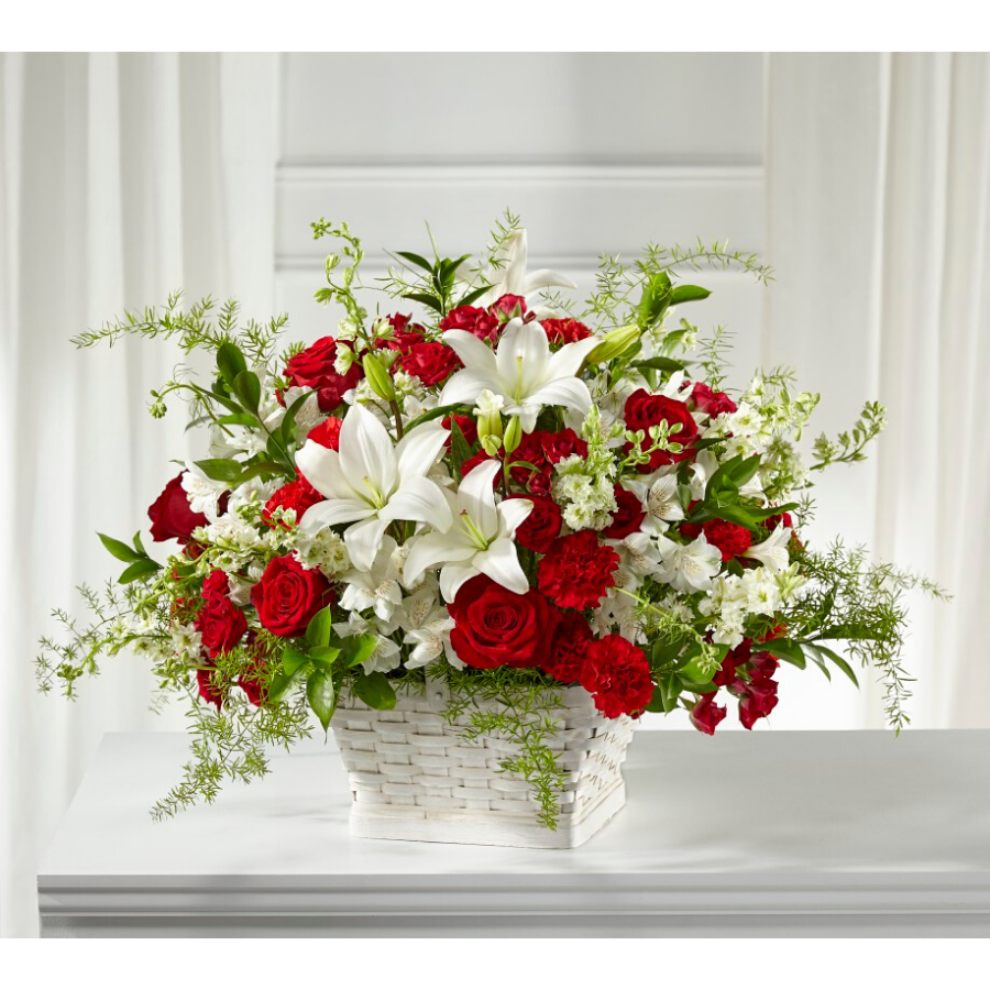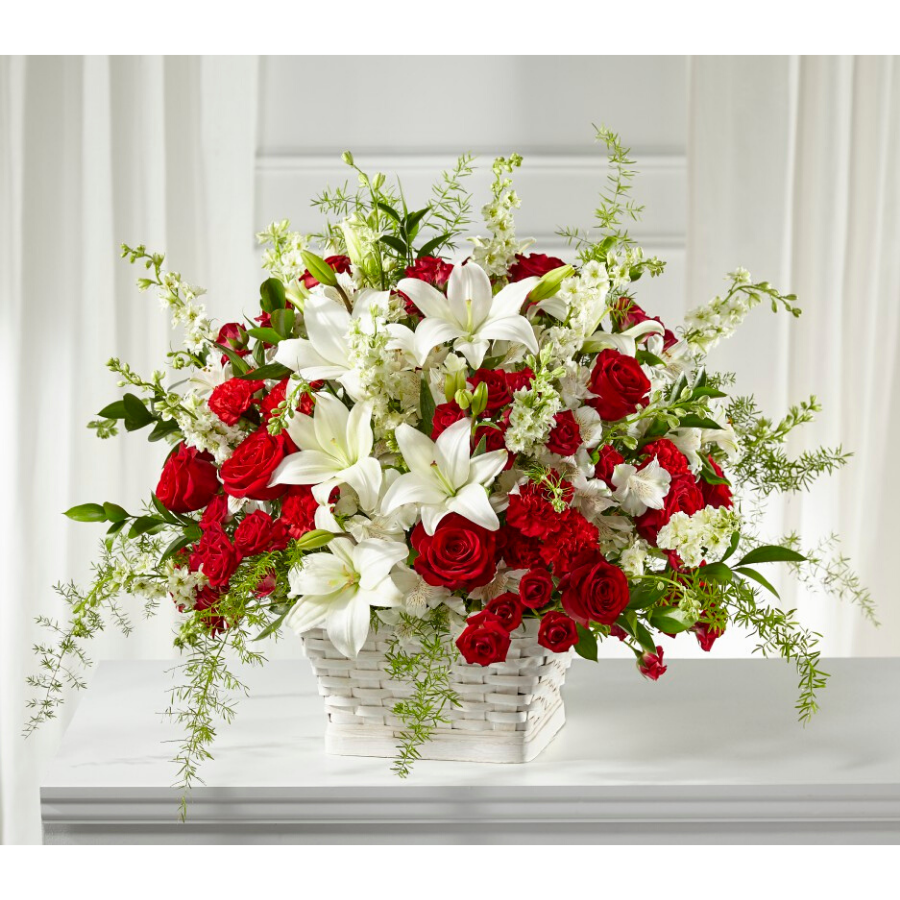 Our Sentiments of Love Arrangement is crafted with bold red and soft white blooms to beautifully display your respects during times of sensitivity. Each bloom is composed with grace and elegance as it is placed by a local florist in a white basket. It features a unique collection of lilies, roses, larkspur and carnations that is fit to send to either a home or service.