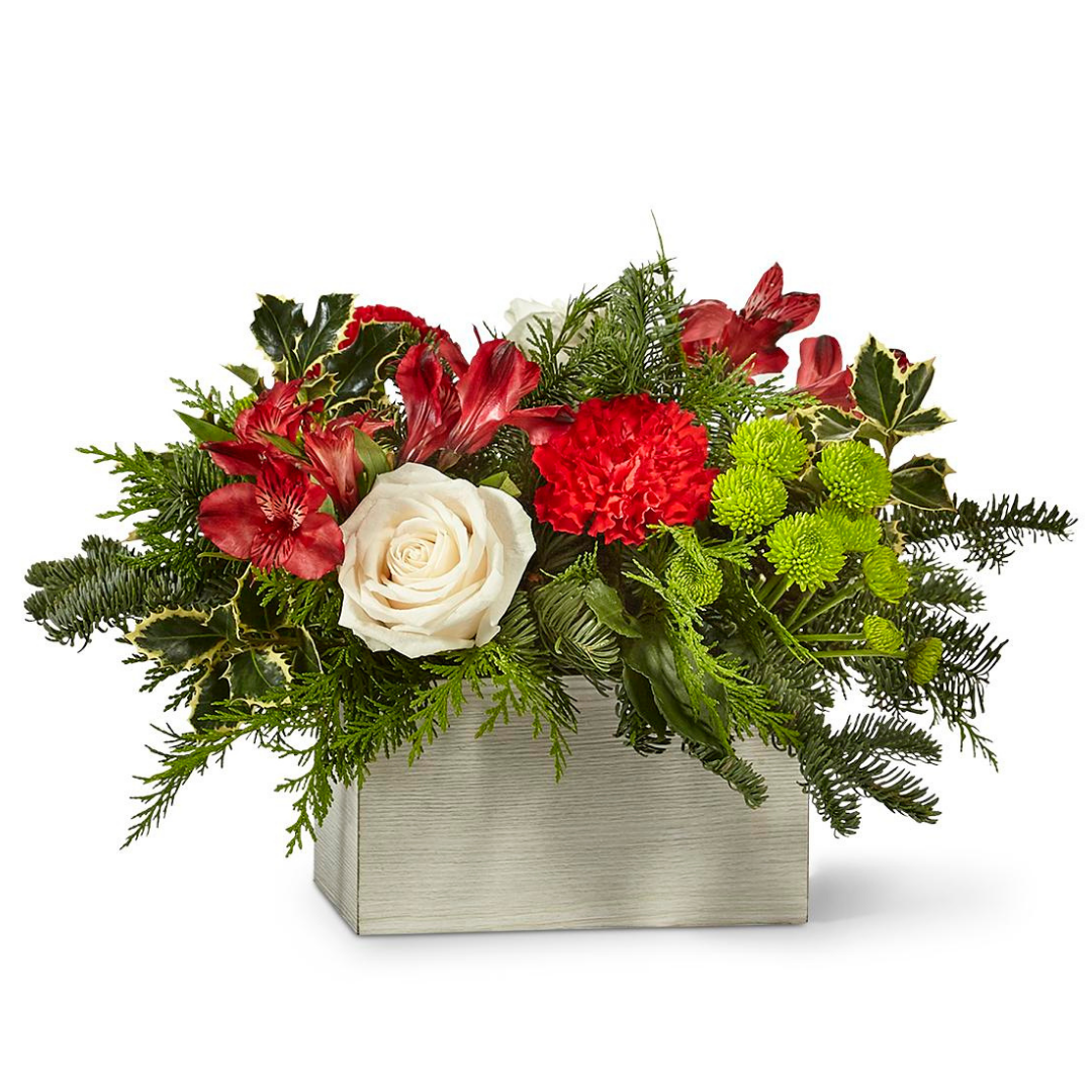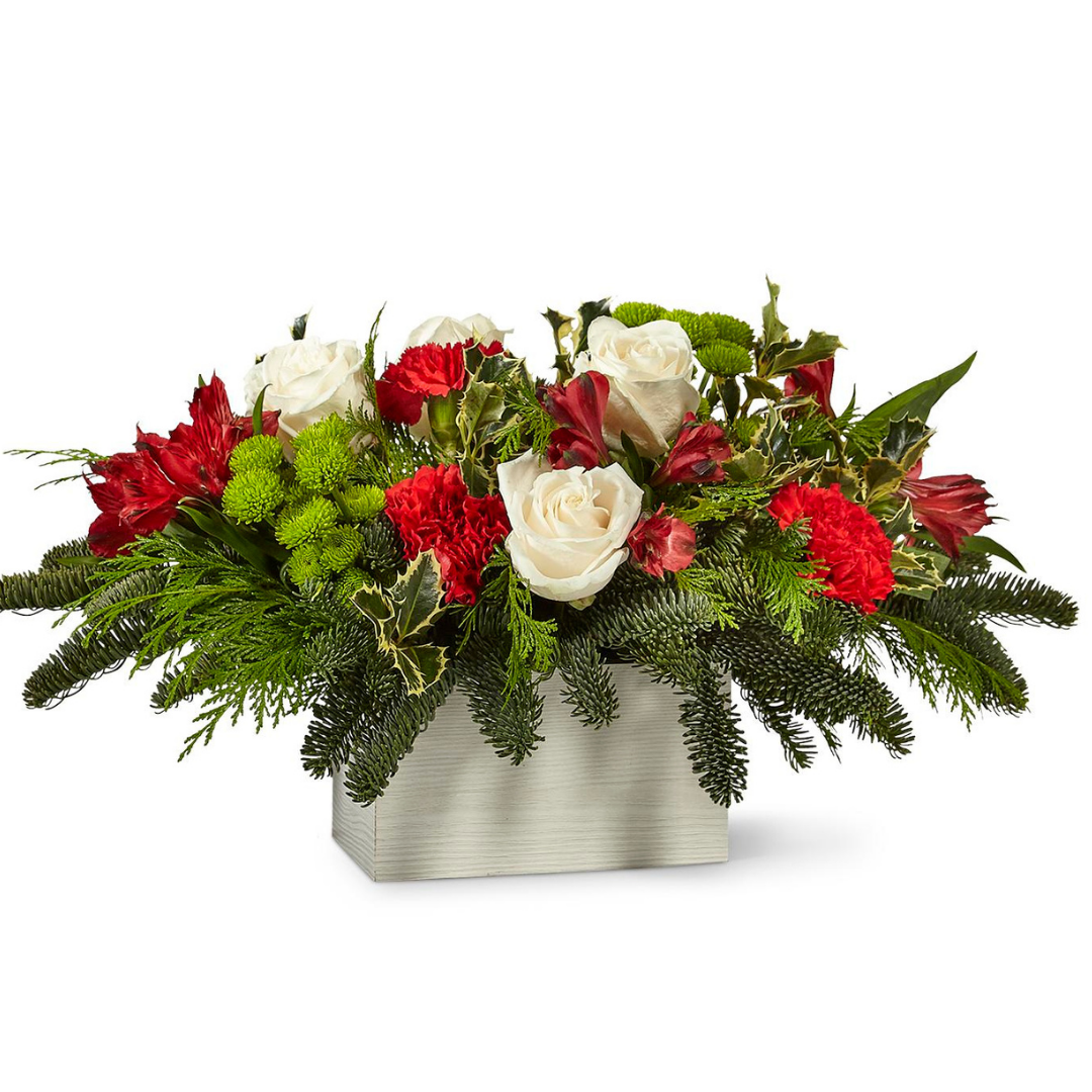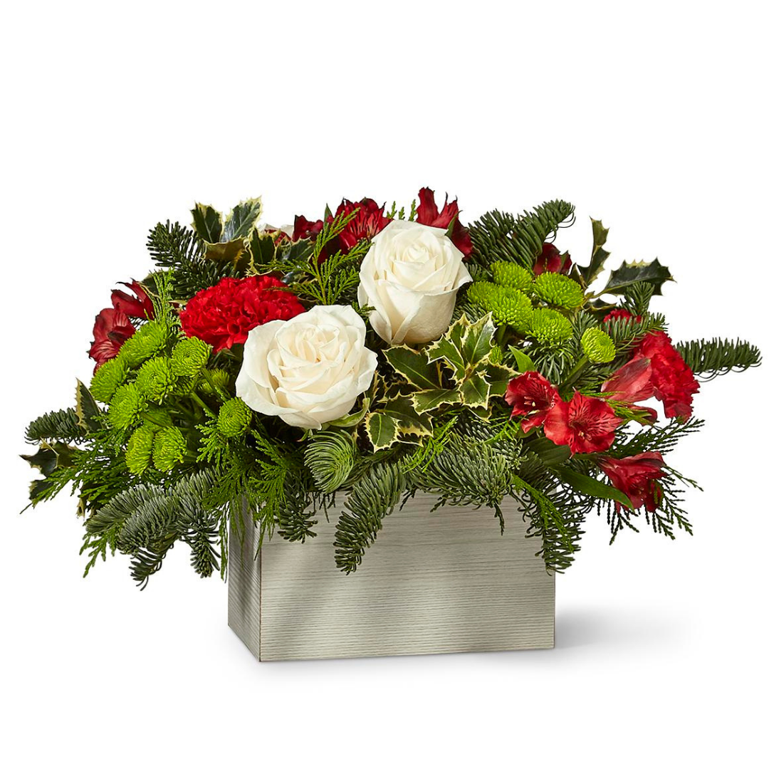 Get ready to have a ball with the Snowball Bouquet! Red, white, and green flowers pop against a whitewashed wooden container for a colorful and rustic design. The Snowball Bouquet makes a great Christmas centerpiece or holiday gift.