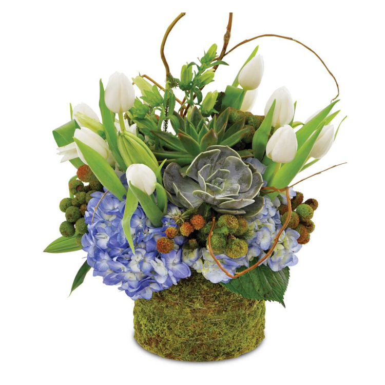 This lovely spring design allows you to experience the outdoors without the sneezing! Soft earth tones accentuate the brilliant blue flowers and bring this season of rebirth into your home. The arrangement comes in a gorgeous glass vase enhanced by a moss garland, which provides an extra touch of fresh simplicity.