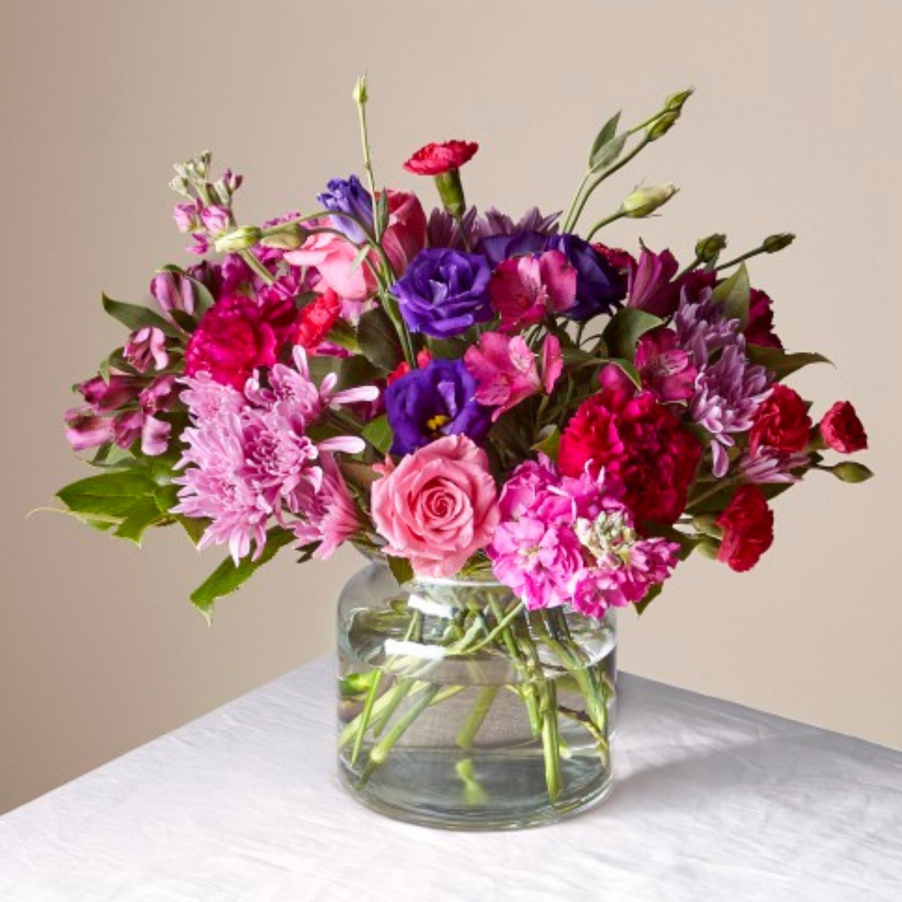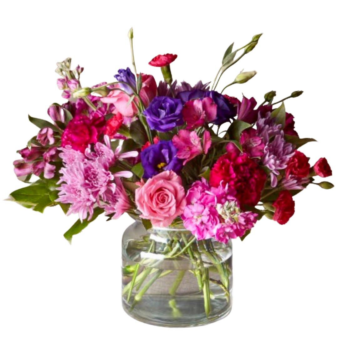 Love is sweet, love is bright, & love is unique. Remind your Galentine, mom or someone special that you love them with this beautiful bouquet featuring carnations, pompons & more beautiful flowers in a clear glass vase.