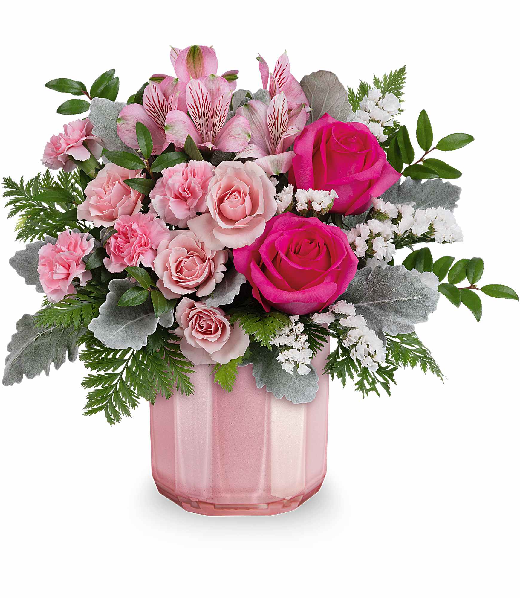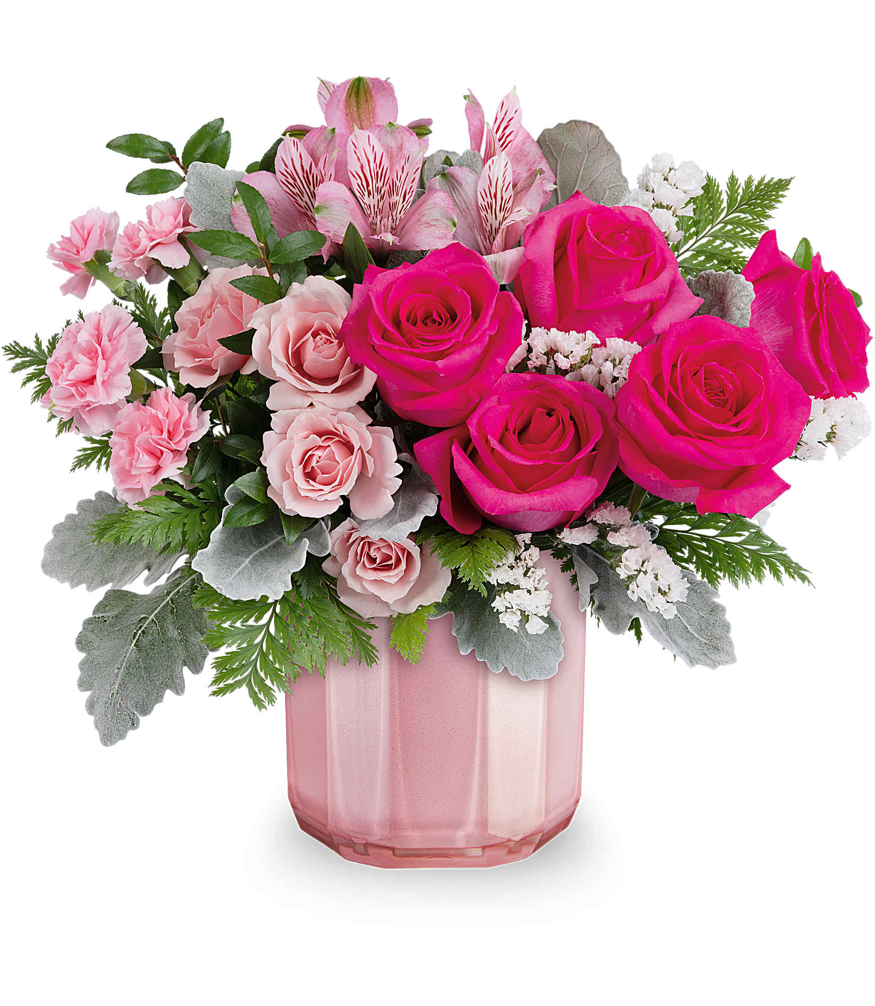 Keep them blushing with the most beautiful pink Valentine's Day bouquet, elegantly displayed in a sculpted pink glass vase featuring a stunning pearlescent finish.