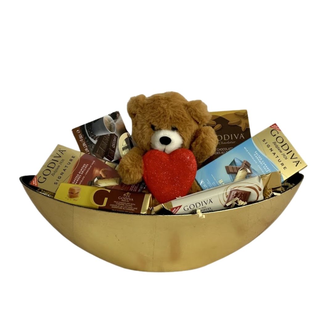 This fuzzy teddy in a soft plush design presides over an assortment of premium gourmet treats.