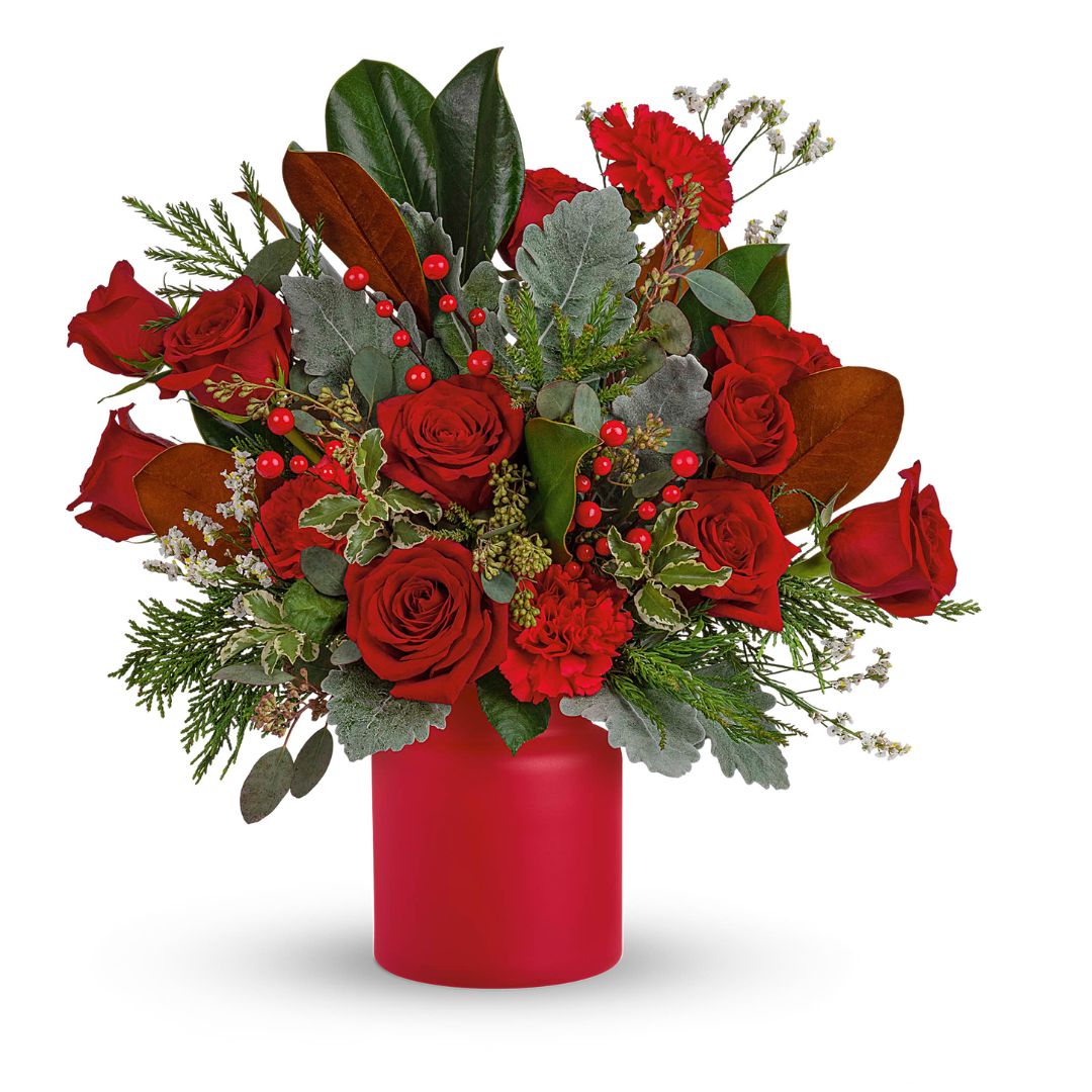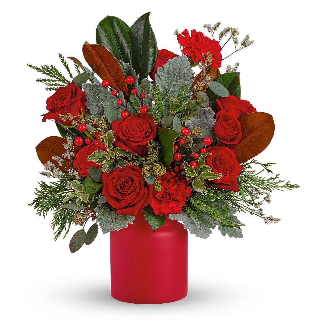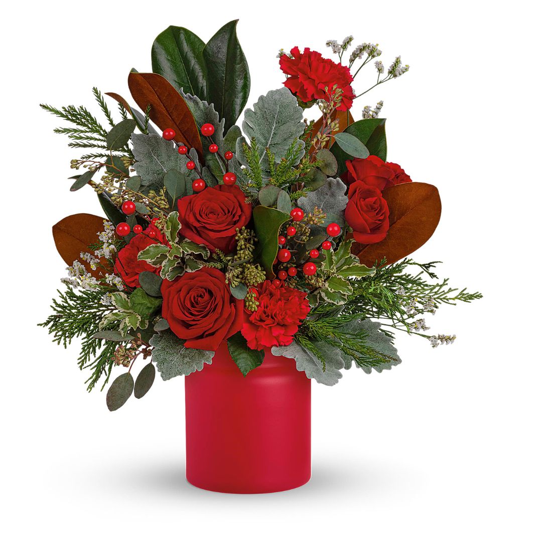 Simply unique, this gorgeous green and red design is artfully hand-arranged in a timeless matte red vase.