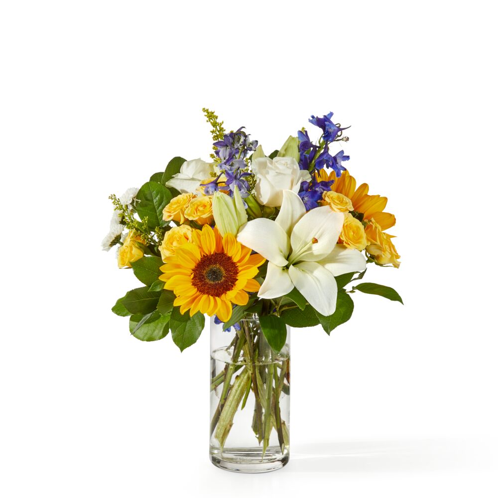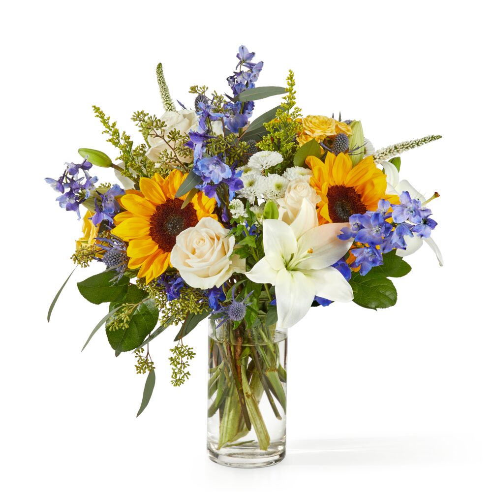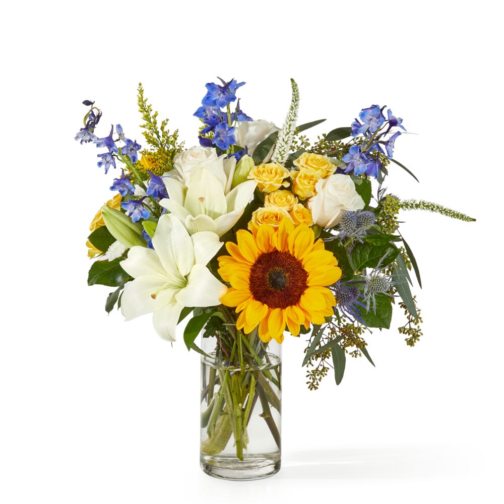 Like sending a sunny sky to their doorstep, this arrangement boasts blue delphinium, white roses, and yellow spray roses to instantly brighten their day.